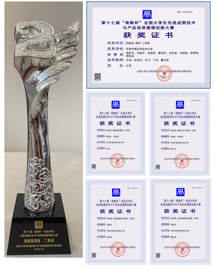 在我校各部门的支持下,机械工程学院王伟、宋亚杰、戈美净、丁洁、刘飞、戴文婷、赵文杰老师,自2024年3月开始通过每周固定时间训练、指导不间断的方式,组织来自机械工程学院、航空航天学院、汽轨学院、智能制造学院不同专业的百余名参赛学生有序进行绘图建模、赛事训练。通过4月校级竞赛、5月市级竞赛的层层筛选,我校获得2024年天津市大学生先进成图技术与产品信息建模创新大赛总团体一等奖;单项团体一等奖1项,二等奖2项;个人一等奖5项,二等奖7项,三等奖6项,最终确定了1支队伍、共计16名选手代表天津中德应用技术大学参加全国总决赛。