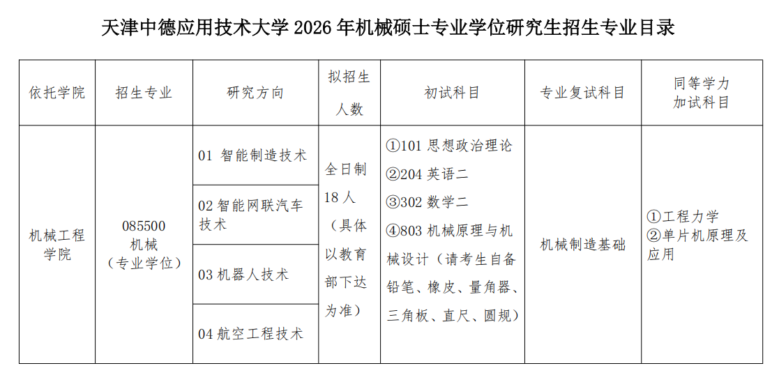 天津中德应用技术大学2026年机械硕士专业学位研究生招生专业目录